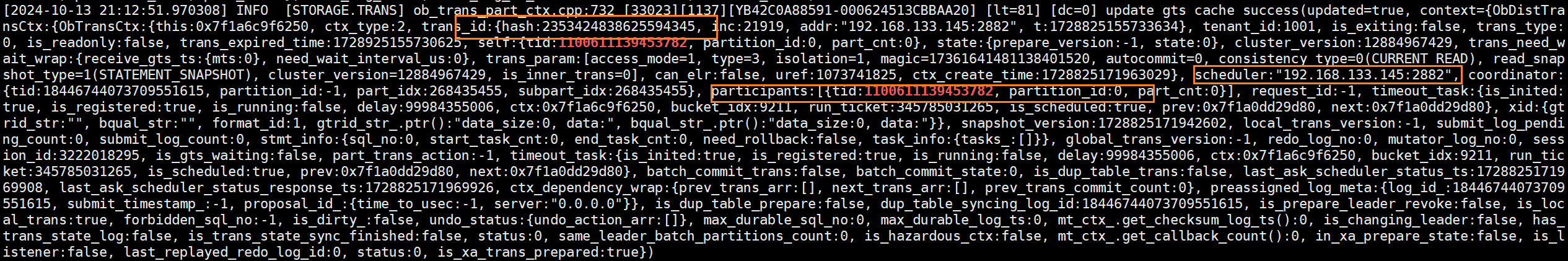(3)在zone3(145节点) observer日志发现事务id是2353424838625594345,可以看到调度者就在145节点,参与者也是就是p0分区自己,也在145节点。