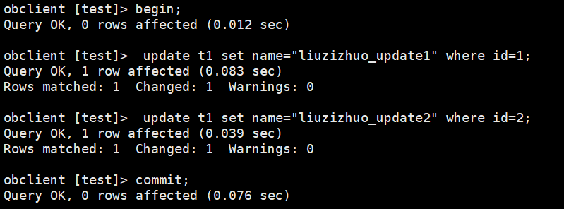 obclient [test]> begin; Query OK, 0 rows affected (0.016 sec) obclient [test]> update t1 set name="liuzizhuo_update1" where id=1; Query OK, 1 row affected (0.009 sec) Rows matched: 1 Changed: 1 Warnings: 0 obclient [test]> update t1 set name="liuzizhuo_update2" where id=2; Query OK, 1 row affected (0.012 sec) Rows matched: 1 Changed: 1 Warnings: 0