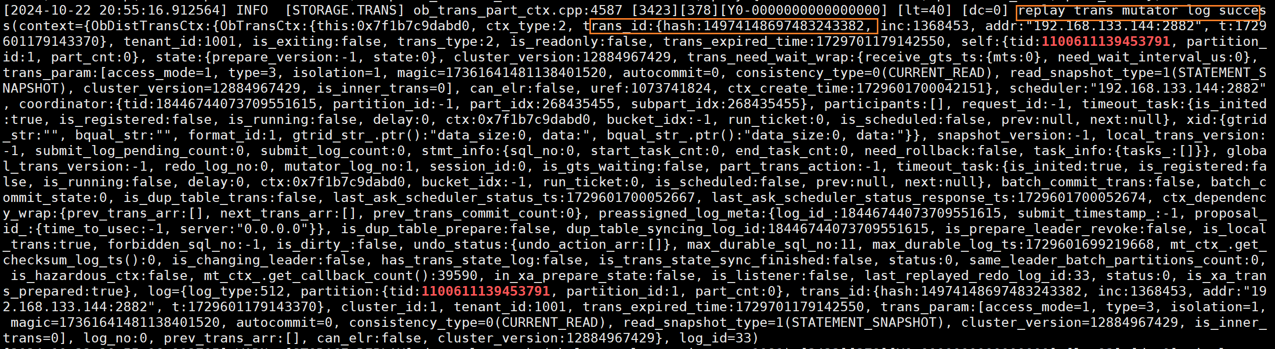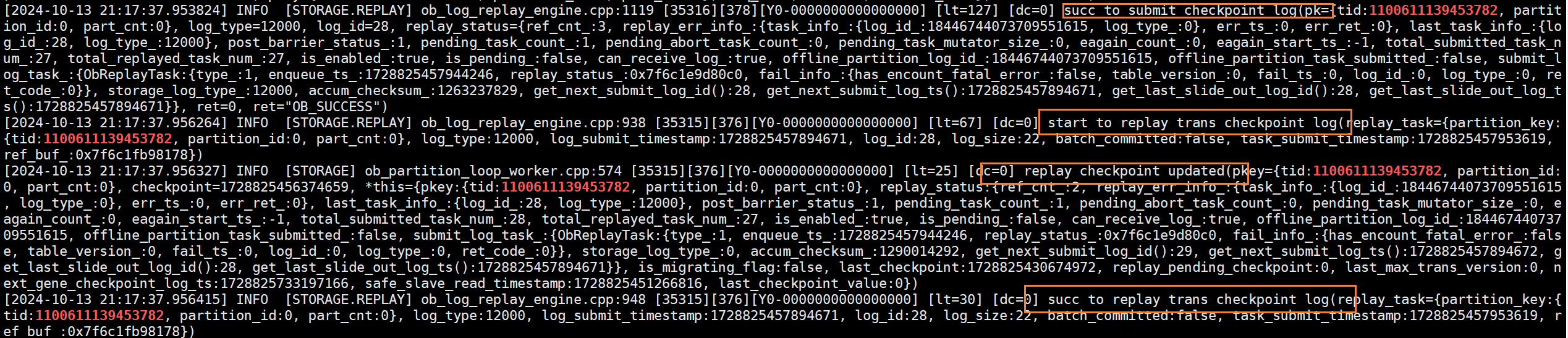 (8)在还未commit期间,根据事务id解析Clog,发现很多类型为OB_LOG_MUTAOR的日志,该类日志记录了未commit期间所持久化并同步的redo,第(6)步看到的回放动作也是在回放这些redo记录。