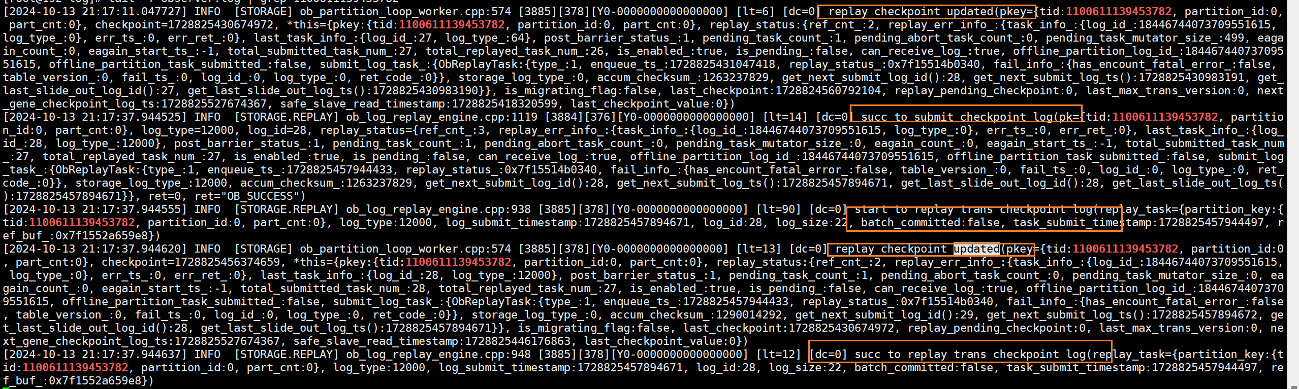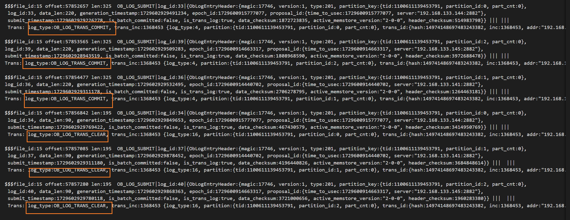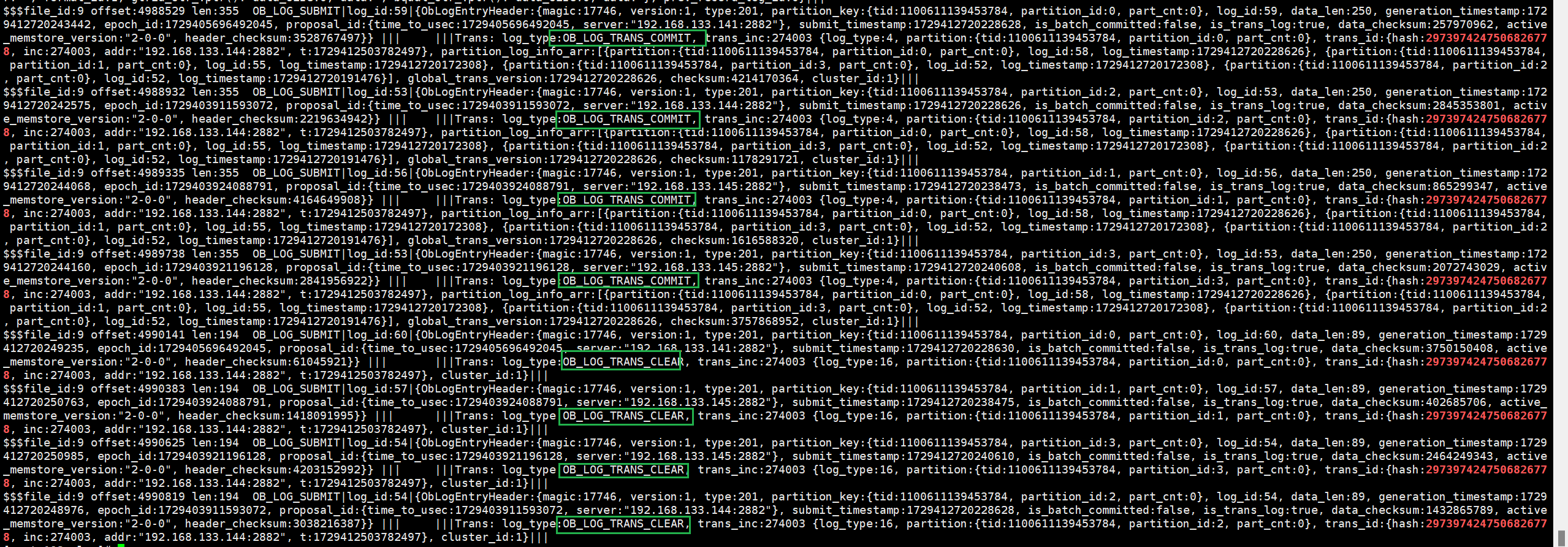 (8)根据事务id来grep 解析后的其他节点Clog文件可见OB_LOG_SP_TRANS_COMMIT日志已经从leader副本同步至了follower副本。