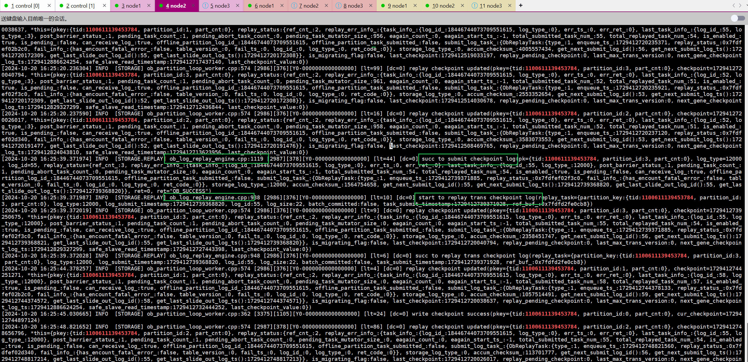 (5)执行commit。commit后,三个节点中任意一个节点的observer日志当中可以看到大量的关于回放redo的日志,并且能够看到redo回放开始的动作以及回放成功的动作。