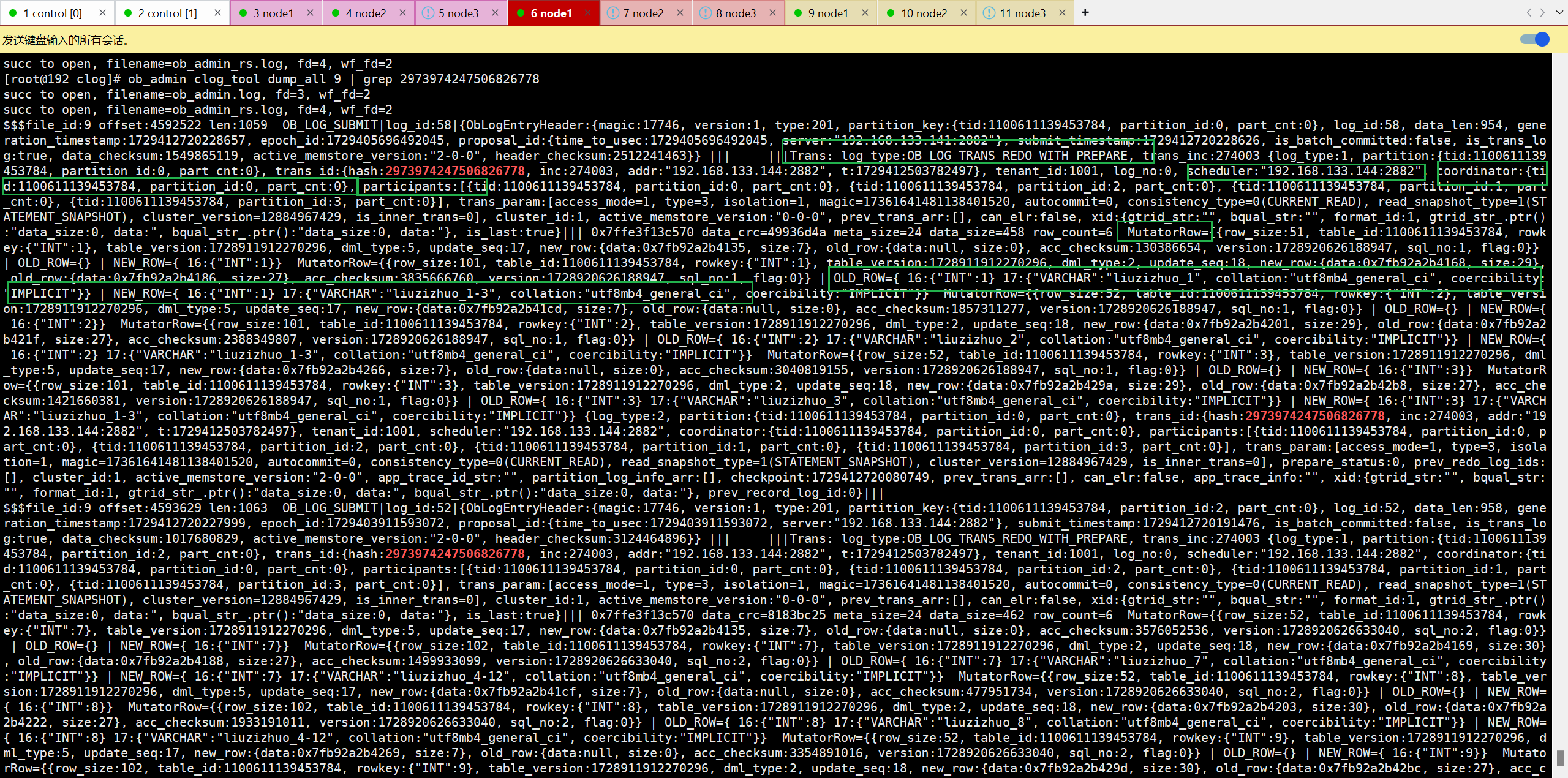 本实验是:在一个事务内将4个分区的12行数据全部修改,以构造一个分布式事务,并观察OB的行为与Clog写入情况。