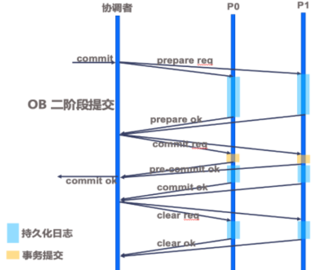 除了prepare with redo日志外,还有OB_LOG_TRANS_COMMIT和OB_LOG_TRANS_CLEAR,这就是OB两阶段提交各个参与者在pre-commit ok后所持久化的commit日志和clear日志。