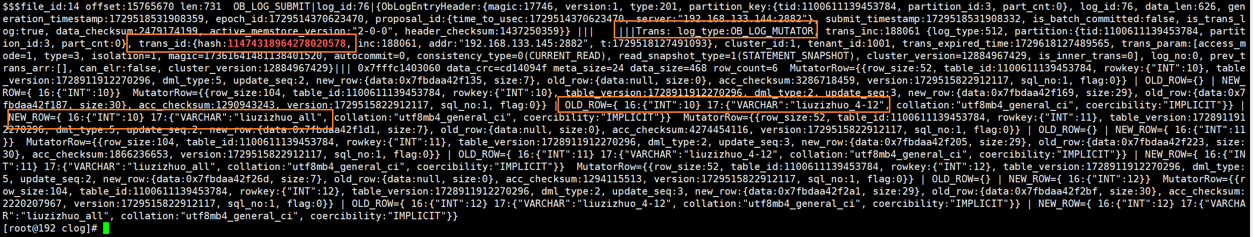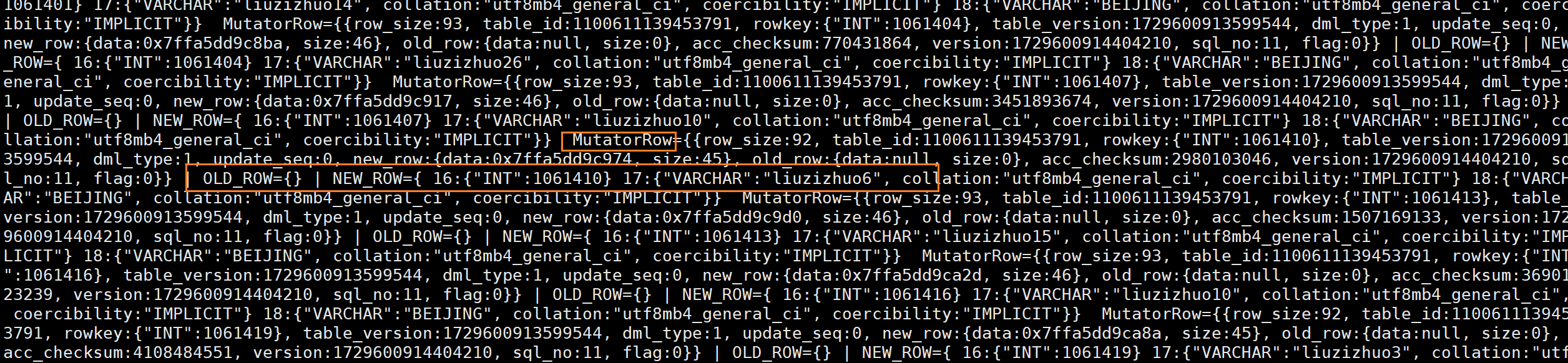 (7)这时还没有commit,但解析Clog就已经能够看到大量mutator日志了,这些日志便记录insert的内容。