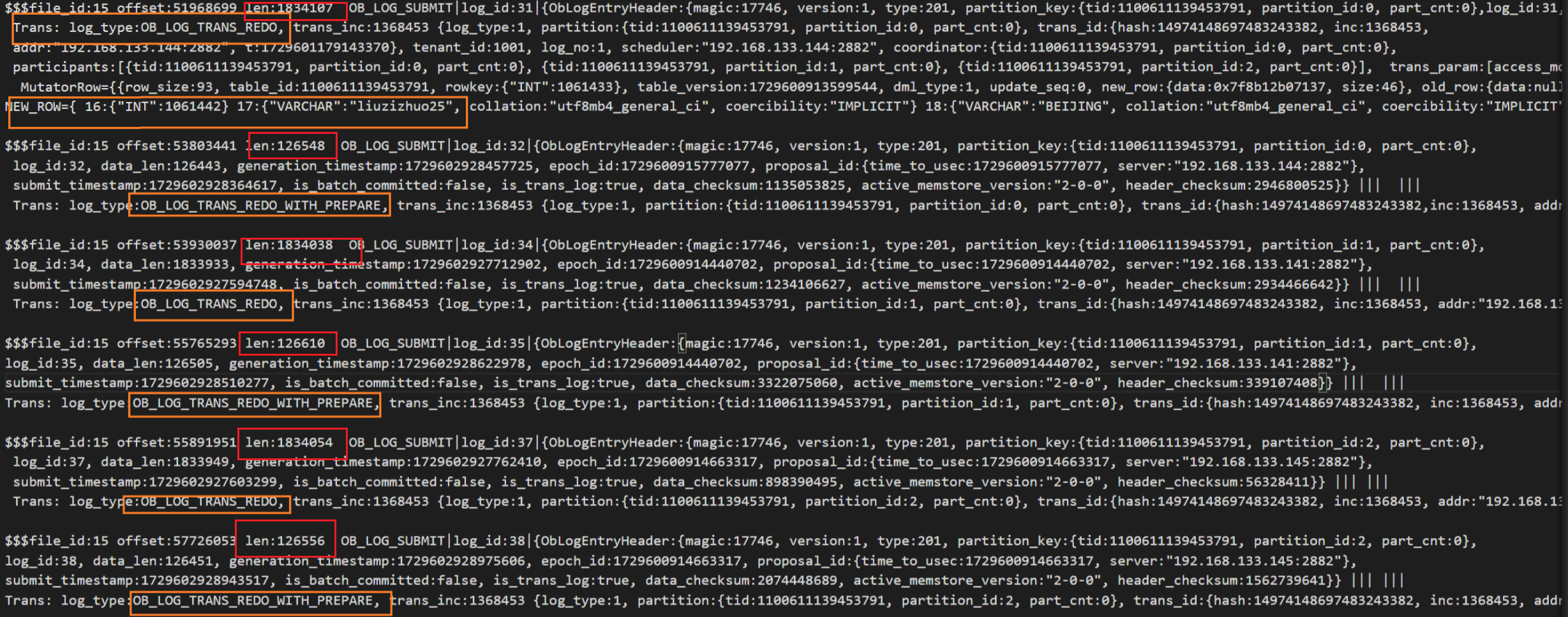 (6)再次根据事务id解析Clog日志,可以看到日志类型为OB_LOG_TRANS_REDO_WITH_PREPARE的日志,这一类型的日志是分布式事务的 prepare 日志,同时包含了本次事务的redo日志。从中还能够看到调度者scheduler为会话建立的节点144,协调者为141节点的副本,可见调度者和协调者不是同一节点,协调者则是第一个参与写操作的参与者,即分区P0(141节点)。