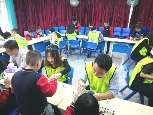 市场部部长凌芸女士(右二)与特殊儿童们一同参与手工制作