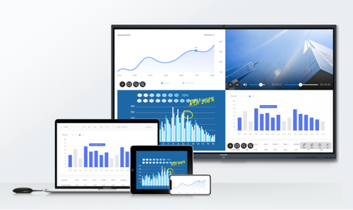 此外,通过多个MAXHUB无线传屏器或MAXHUB传屏助手,SC65CD还可以实现4台设备分屏显示,对比展示操作可以更加便利。除了使用MAXHUB无线传屏器,在会议平板上用户还可以反向操控电脑,还可以使用Android 5.0 及以上系统的手机、Pad直接操控会议平板,进行书写、批注、文稿演示等,实现双向的灵活互动。