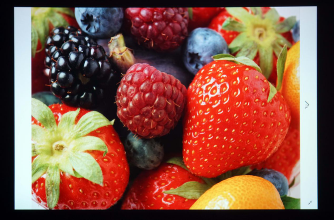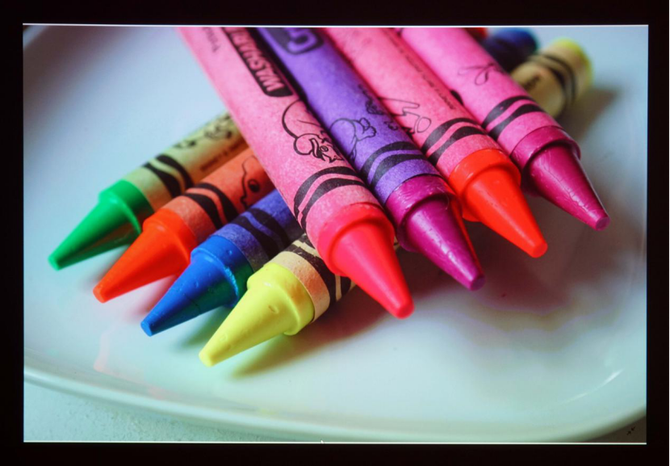 可以看到,照片的色彩表现非常优秀,丰富的色彩投影到荧幕上之后被很好的还原,画面细节蜡笔表面的坑洼清晰可见,质感还原良好。