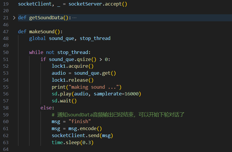 • 语音合成模TTS:语音合成模块使用了SummerTTS。SummerTTS是一个基于C++的开源项目,基于Vits并使用Eigen提供的矩阵库实现了神经网络的算子,仅使用CPU即可快速完成语音合成,我们在其基础上进行了类封装并将其通过Swig编译为python可调用的动态链接库(SummerTTS-python)。调用SummerTTS可以将文字输出为numpy.int16格式的数组,通过pyaudio或sounddevice可以直接播放。由于在播放过程中会产生阻塞,我们将其放到另外一个python程序中执行音频播放,并通过socket做音频数据的传输。