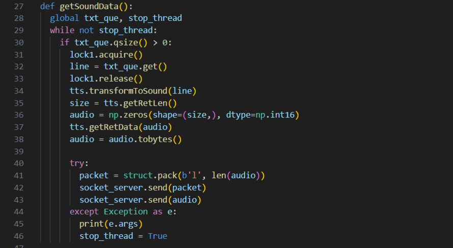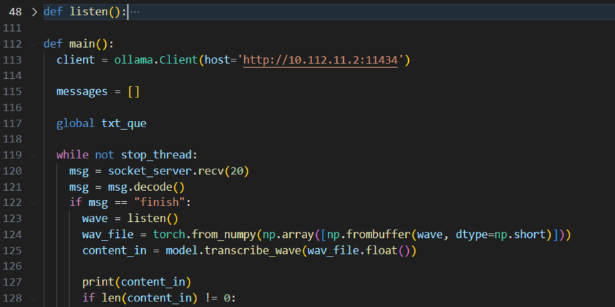 • 调度程序:调度程序使用了Ollama框架,首先使用Ollama在云端启动一个大语言模型(本项目使用的语言模型为Qwen1.5-72B),然后在端侧建立连接云端大语言模型的客户端,再之后就可以使用使用Ollama api 进行调用了,调用方式采用流式,云端以单个字符的方式发送给端侧推理结果,在接收到推理结果后,为了方便音频输出,我们需要对结果进行断句。本项目使用一个全局的队列,将生成的每个句子放到队列里供语音合成模块使用。