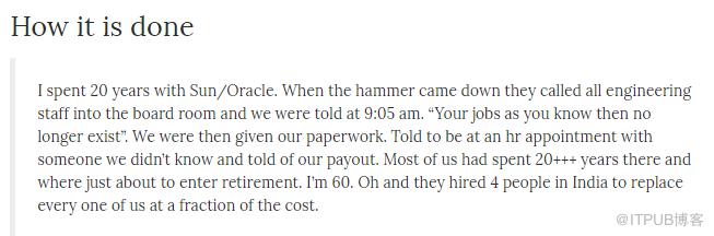 “我在升阳/甲骨文20多年,裁员那天上午9:05,团队里的工程师都被叫到会议室说被开了。接下来,我们又被叫去和以前根本不认识的人开了1个小时会,知道了自己的payout。我今年60,再过一段时间就要退休,听说公司为了省钱在印度招了4个人代替我。”