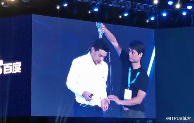 在演讲过程中,有个观众突然冲上演讲台,向李彦宏头部倒了一瓶水。李彦宏先是一愣,后来用英语问道:What's your problem?