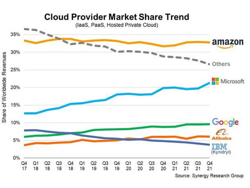 数据还显示,亚马逊云科技仍然是云服务的引领者,截至 2021 年第四季度,其全球市场份额约为 33%。其中,微软的大踏步增长,让“云计算大战”变得越来越有看头。现在,微软全球云服务市场约占22% 的份额,用 18 个季度将其市场份额翻了一番。
