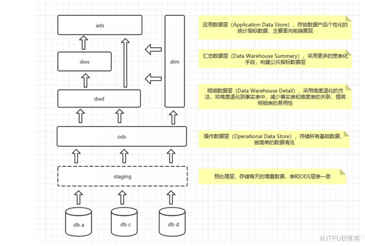 DWB:Data Warehouse Base 数据基础层,存储的是客观数据,一般用作中间层,可以认为是大量指标的数据层。