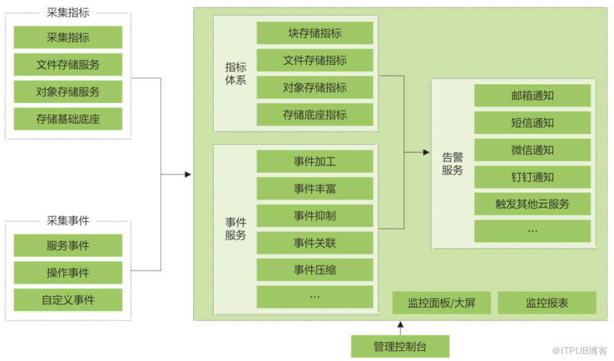 云平台存储全方位监控建设方向应当包括至少以下四个方面:云平台存储基础底座监控、云平台存储产品监控、事件告警平台、多维度图表展示及报表,形成一个完整的云监控服务,其架构如图1所示,下面将一一进行介绍: