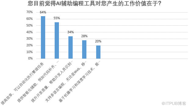 64%的开发者认为,AI工具可以提高效率,能自动化执行繁琐任务。55%的开发者认为,随着AI工具的不断成熟,将在智能化辅助方面提供助力,例如代码补齐、错误提示和建议等。AI工具带来的价值是,支持多语言编程,无论是Web、移动应用还是数据分析和机器学习,都能找到相应工具。有28%的开发者看好这一技术方向,未来通过自然语义进行代码编程,也不是没有可能。