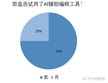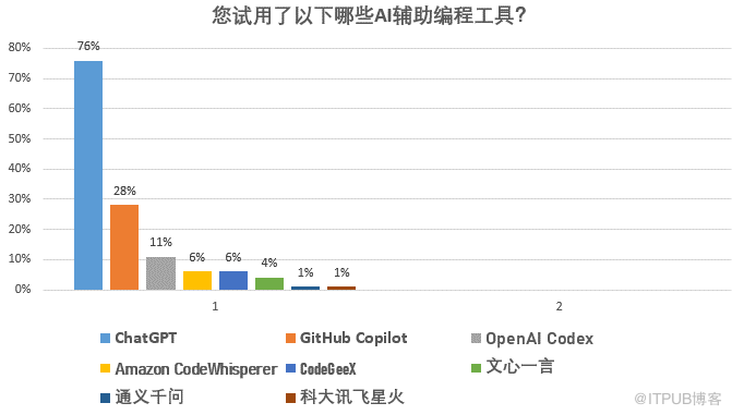ITPUB发现,大多数人都试用过AI工具,有75%的开发者试用了AI辅助编程工具。其中,有76%的开发者试用了ChatGPT,其次是GitHub Copilot(28%)、OpenAI Codex(11%),再然后是Amazon CodeWhisperer 和OpenAI Codex,开发者各占6%,问心一言为4%,通义千问和科大讯飞星火均是1%。