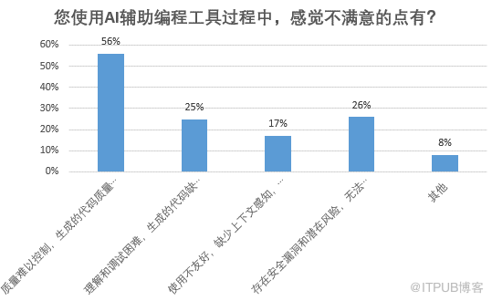 3、AI辅助编程工具的成熟度和质量是最大槽点,52%的开发者认为,仅能满足部分场景需要,距离实际应用还差得很远,准确率、理解率和安全性有待提高。