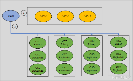 (4)Client根据CRUSH算法,计算获得数据的所有OSD节点(Primary),然后进行数据读写。