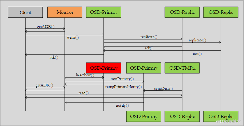 (3)新的OSD Primary节点通知Monitor临时的数据处理方案(将OSD Replic 节点作为临时主节点响应客户端的数据请求处理)。