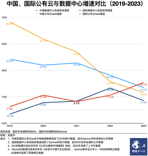 《财经十一人》对比了近5年来中国和国际的公有云IaaS、数据中心投资增速,发现两者发展趋势截然相反。IDC和Gartner数据显示,2019年以来中国的数据中心投资增速不断上升,公有云IaaS市场增速下降。国际市场公有云IaaS市场增幅则是始终高于数据中心投资增速。