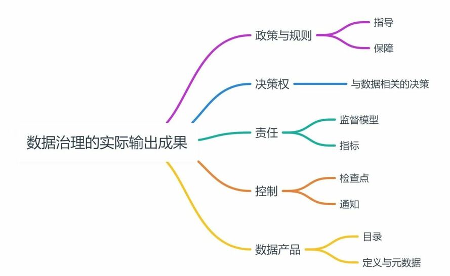 (1)政策与规则;指导与保障(2)决策权;与数据相关的决策(3)责任;监督模型;指标(4)控制;检查点与通知(5)数据产品;目录;定义与元数据