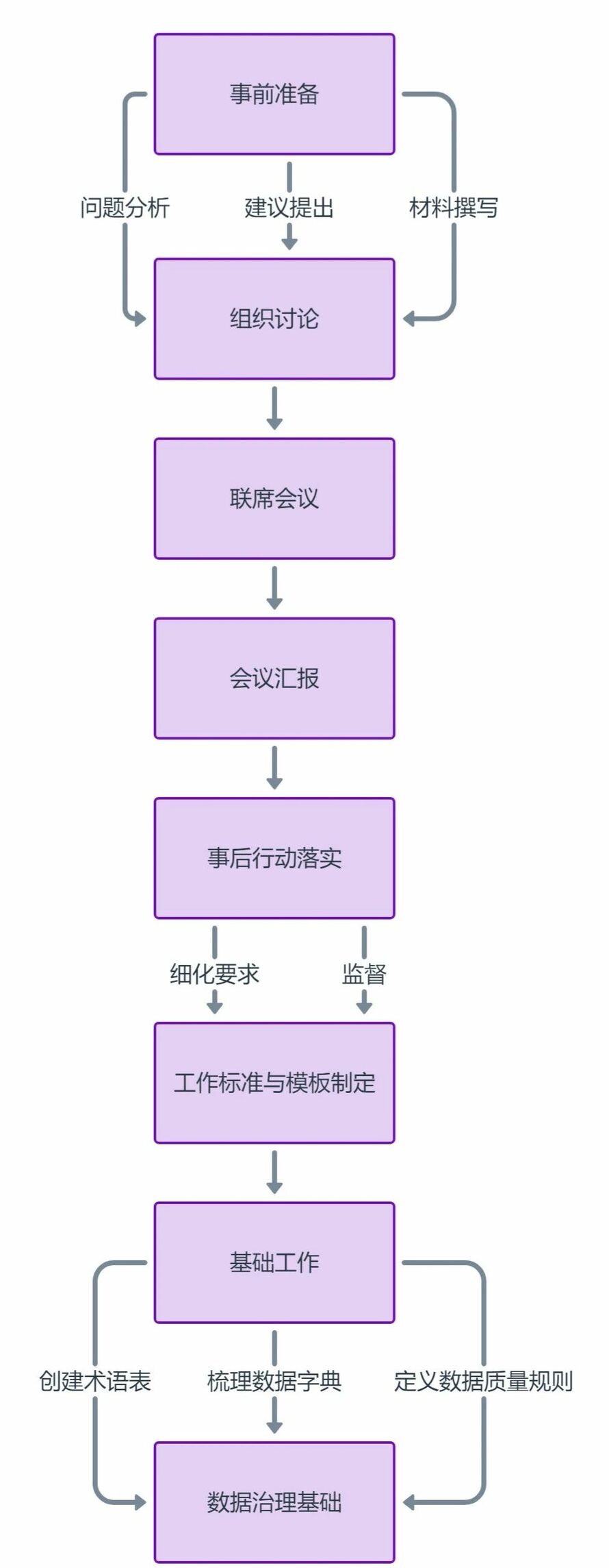数据治理团队需为这些会议做大量准备和分析工作,包括事前的准备、事后的行动落实和监督。然而,并非所有人都能认识到这种工作的价值。人们往往更认可直接的业务价值,而非这种能提高决策效率的组织价值。