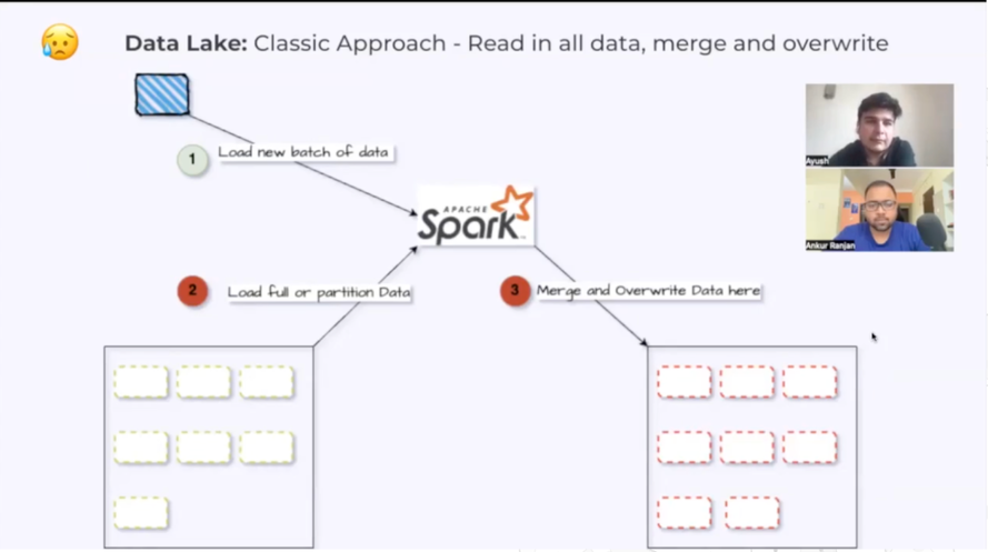 为了为他们看到的改进的更新插入和合并操作提供更好的直觉,Ayush 解释了图书馆员如何在数据湖和数据湖房范式下组织物理图书馆文件。在这个比较中,我们的“图书馆员”在功能上是我们的计算引擎,它在这些场景中执行繁重的计算工作。在数据湖范式中,一批新的论文将被归档到许多松散组织的论文中。然后,图书馆员必须检查之前的每组论文,将它们组合起来,然后插入新的论文。这是因为现有的论文没有经过特别的组织,因此我们的图书馆员需要检查每一篇论文以使它们相对于彼此进行组织。