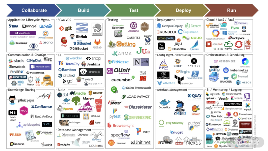 用于持续交付的工具有很多,这里不一一列举,借用James Bowman的一张图: