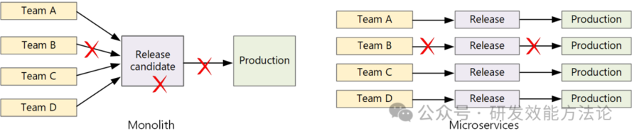 每个团队可以独立构建、集成和部署自己的微服务,而不会影响或破坏其他团队;