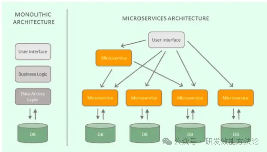 如上图所示,从单体到微服务,我们可以看到图左边是一个单体服务,右边则是经过微服务拆解后的。我们可以看到它有 4 个特点: