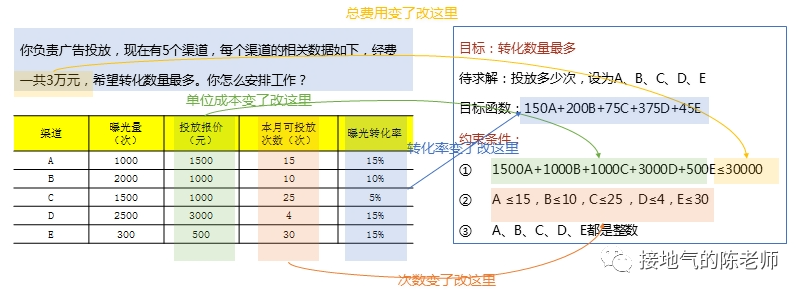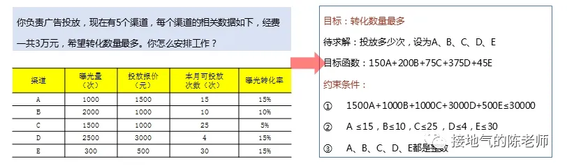 算法模型最大的优势,并不是比人聪明,而是运算速度快+省事。比如经典的互联网推广问题,各种限制条件一堆:“推广总预算,每个渠道转化率,每个渠道可以预约档期数量”等等。