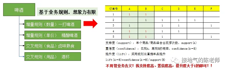比如做商品分析的时候,业务上是可以手动输出一份《商品关联规则表》,但这个表格的规则是固定的。如果用关联规则算法,则可以突破业务思路的限制,发现更多潜在关联销售逻辑。虽然不见得是“啤酒与尿布”这么夸张的东西,但是也对启发业务思路很有帮助(如下图)。