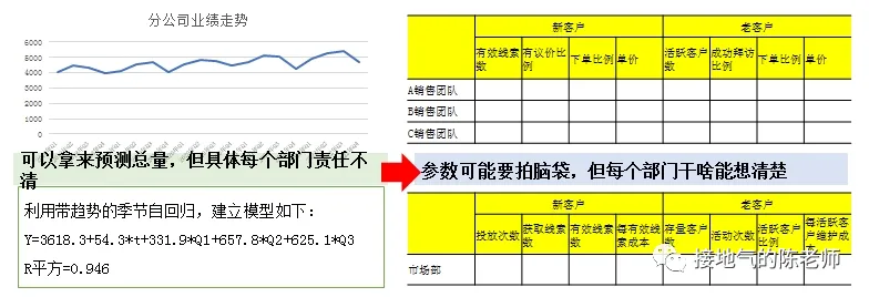 此时如果用业务模型来预测,可以直接把整体指标按部门拆开,让各部门填写自己预期情况。虽然具体参数可能需要拍脑袋得出来,但是每个部门能直接看到自己需做到什么水平,从而反向激励业务必须行动。即使没有完成任务,也能清楚看到“是谁没完成”。从而更快速地思考对策。