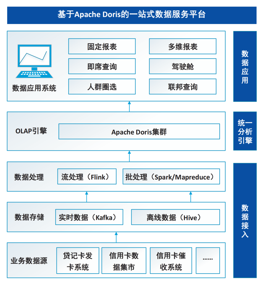 兴业银行信用卡中心基于Doris OLAP数据库的系统架构(见图)主要包括数据接入层、Doris统一数据分析引擎和数据应用层,各层次之间通过高效的数据传输和共享机制,实现了数据的快速处理和分析。