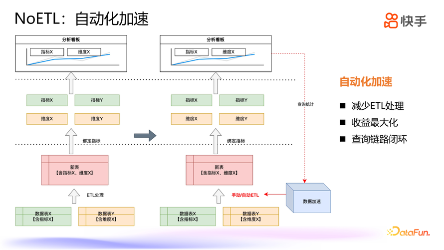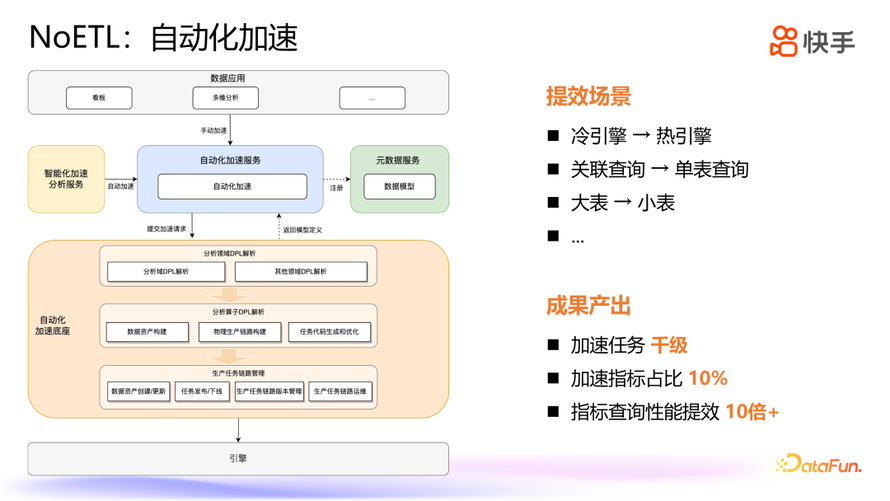 自动化加速的具体实现如上图所示,核心模块包括智能化加速分析服务、自动化加速服务和元数据服务。根据上层不同的加速需求制定生产任务,并进行管理和运维,实现自动化加速能力。自动化加速解决了场景三的问题,即自动识别指标维度来构建小表来提高查询性能。除此之外,也适用于其他一些场景,比如支持整表加速,可以将 Hive 表数据一键转化为热引擎 ClickHouse 数据;基于大表加工成小表,剔除正常查询过程中不使用的数据,从而提高查询性能。目前,自动化加速在快手使用中也获得了很好的效果,加速任务量级达到千级,涉及加速的指标占整体指标量级的约 10%。实验表明,加速前后的查询性能提升可达 10 倍及以上。以上就是快手大数据分析在 NoETL 理论驱动下所做的一些工作,首先是通过引入指标中台,对分析链路上的数据服务进行了规范化和标准化,为 NoETL 在各个环节的应用打下了基础;另外,针对分析链路中的常见痛点场景,通过自定义字段、自动化建模和自动化加速,减少了 ETL 操作,实现了整体分析效率的提升。04