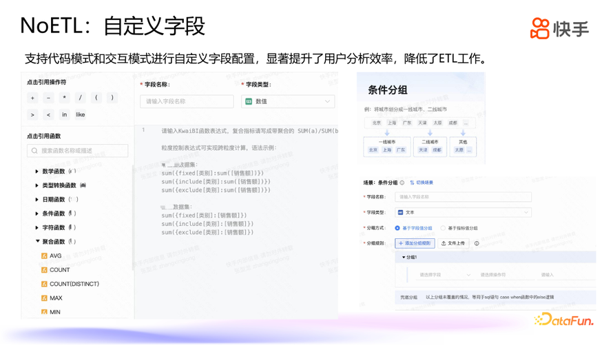 为了解决场景一的问题,即如何灵活地新增指标和维度,我们提供了自定义字段的能力。以一个例子来说明,传统模式下,若要增加一个新的指标或维度,至少需要开发一个新的表或在现有表中添加新的字段,再绑定指标后在分析场景中使用。自定义字段功能解决的问题是,我们不再需要通过 ETL 处理来生成新的表或字段,而是可以根据上层的指标和维度组合生成逻辑指标,并基于这些新指标提供服务。这种自定义字段方式不仅减少了 ETL 工作量,而且提高了灵活性,允许在上层基于现有指标和维度配置出更多新的指标。例如,我们可以创建两个指标的简单累加,还可以进行维度拼接、字符串拼接,以及 case when 条件判断处理等。