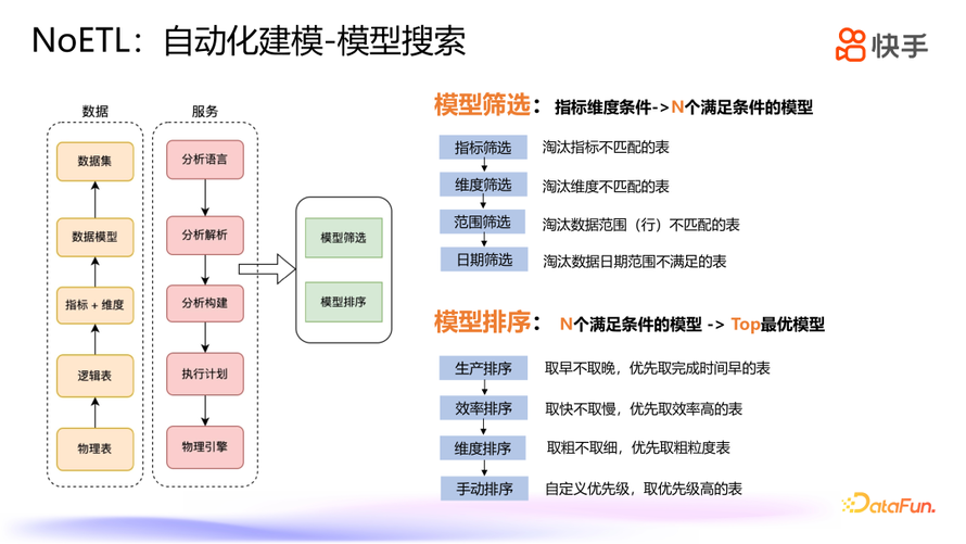 有了自动化建模,从分析角度来看,在整个查询链路中,我们需要从自动构建的模型中选择最合适的以提高分析性能。这一过程可以分为两个部分:模型筛选和模型排序。模型筛选是指从所有模型中找到最满足条件的模型。首先会基于当前分析需求涉及的指标和维度,找到满足条件的模型;然后根据数据范围、时间范围再次筛选满足条件的模型。基于筛选出的模型需要进行排序,找出查询性能最 优的模型,比如不同模型涉及的物理表可能来自不同的引擎,我们会优先选择计算速度最快的引擎,例如相比于 Hive 会优先选择 ClickHouse 中的数据,而 Druid 可能优于 ClickHouse 中的数据,或者在多维建模场景下,Cube 可能优于传统的 ClickHouse 场景等。基于这一套模型搜索能力,结合自动化建模,我们不仅提高了建模效率,降低了 ETL 工作量,还提升了查询性能。