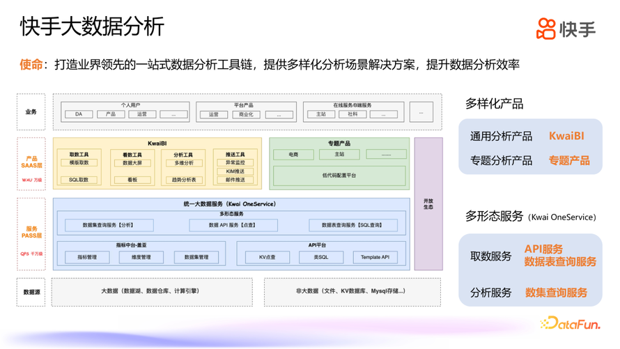 从数平的职责中也可以看出,分析决策对业务至关重要,这也引出了快手大数据分析的使命:打造业界领先的一站式数据分析工具链,提供多样化分析场景解决方案,提升整体分析效率。目前,快手大数据分析对外提供的能力可分为两类:多元化产品和多形态服务。在多元化产品方面,我们既提供通用化的分析产品,即快手的 BI 系统——KwaiBI;也会针对特定业务需求提供更专业化、定制化的分析产品,即专题产品。此外,我们还提供多形态服务,针对常见的数据查询和分析场景,将这些能力通过接口形式提供给各业务使用。例如,在数据查询中常见的 KV 点查场景,以及通过 SQL 从数据表中查询数据的场景。以上分析能力不仅应用于数据平台部的各类平台,还可提供给业务方用于构建其特有的分析平台。目前,从服务角度来看,我们的 QPS(每秒查询量)已达到千万量级。从产品使用角度来看,我们的 WAU(每周活跃用户数)均在万级。综合来看,无论是在产品能力还是服务能力方面,快手大数据分析均处于业界相对领先的位置。然而,这一成就并非一蹴而就,是经过多年的功能迭代逐步实现的。
