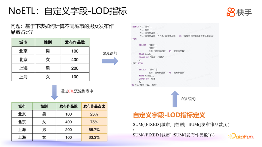 我们还支持更复杂 LOD(level of detail)自定义字段,即在不同粒度下的数据统计分析。例如有一张表存储了每个城市不同性别下的发布作品数,如果我们要计算不同城市男女发布作品的占比,传统模式下需要构建一个 SQL 语句,通过两个视图关联后相除得到结果。在实际分析场景中,若要将占比数据作为一个指标,通常需要在原有表中增加一列:发布作品数占比,然后绑定到占比指标上供业务使用。现在,我们可以通过自定义字段减少 ETL 操作,只需在上层对 LOD 指标进行定义即可。这个表达式在实际执行过程中所转换的 SQL 语句与手动编写的 SQL 相同,保证了结果的正确性。通过这个例子可以看出,我们通过自定义字段减少了很多 ETL 操作,对分析效率和灵活性都有很大的提升。
