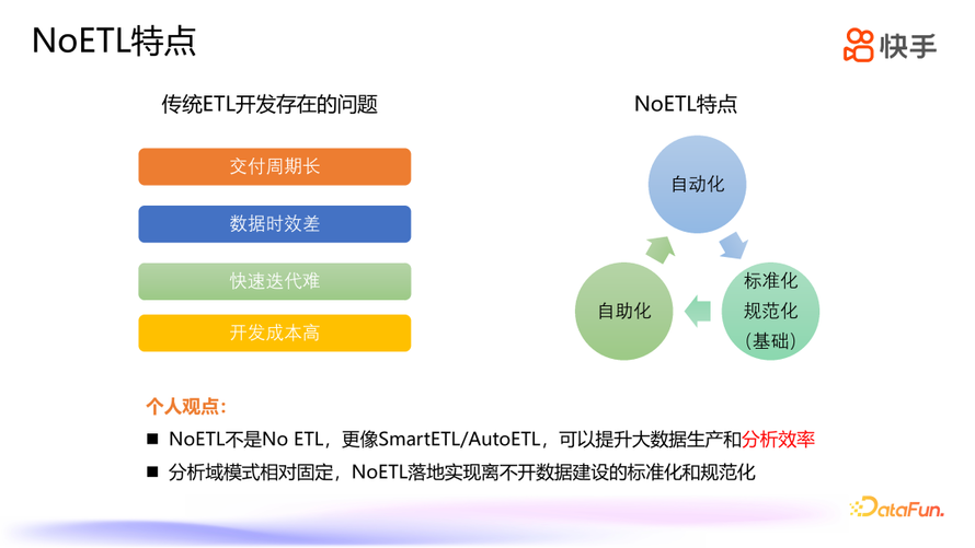 NoETL 并非完全摒弃 ETL,而是更倾向于 Smart ETL 或 Auto ETL。在当前发展阶段,完全无需数据开发和操作不太可能实现,但 Smart ETL 或 Auto ETL 意味着在整个数据处理链路上引入更多自助化和自动化能力,从而降低人工 ETL 的工作量,进而提高整体效率。