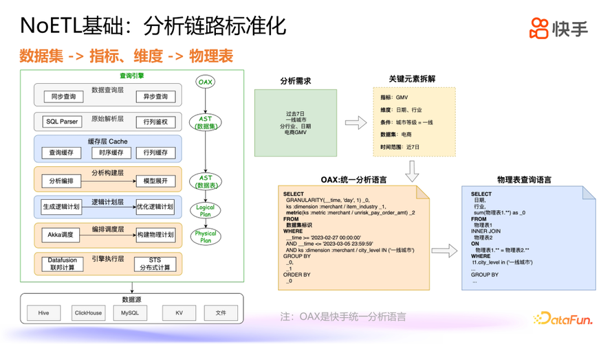 数据标准化是数据自底向上的抽象过程。从服务角度来看,分析服务的实现实际上是一个面向用户自上而下的具象过程。我们需要将数据集映射回指标维度,并最终转换成实际的物理表执行语言。快手分析链路中最上层是 OAX(OAX 是快手的一种快速统一分析语言),能够简洁地表达用户的分析需求。我们将分析需求转换为面向数据集的语法树,然后通过分析构建和逻辑计划分析,识别出具体的数据集,并使用指标维度映射到的数据表,最终构建出物理执行计划并执行实际查询语句。例如用户有一个分析需求,希望分析过去7 天内一线城市电商 GMV 情况。我们将该分析需求抽象成关键要素:指标是 GMV,维度是日期和行业,它所在的数据集以及时间范围。这些关键要素可以转换成统一的分析语言 OAX。这种语言与具体的底层物理表无关,是面向数据集的分析语言。从图中可以看出,它类似于单表查询语言,即选择哪些指标维度 from 哪个数据集,再加上相应的筛选条件。最终,通过上述链路,进行数据解析、分析、构建等,转换成物理表查询语言。实际物理表查询可能会从多张表中查询出相应的指标并返回给上层业务。数据从底向上抽象,服务从上向下具象,通过这两条链路的建设,我们确定了整个分析链路上的数据和服务的标准和规范化。在此基础上,我们可以不断优化整个链路中的功能点,提升自助化率和自动化率,减少ETL,提高分析效率。