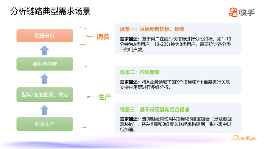 在整个分析链路上,典型的需求场景可以分为两类:一类是面向消费侧,另一类是面向生产侧,下面举 3 个典型的场景示例。场景一:灵活新增指标、维度。这是面向消费侧的一个典型场景。比如用户有一个在线时长的指标,希望对此指标进行分段,将在线时长 1 至 10 分钟的用户归为 A 类用户,10 至 20 分钟的归为 B 类用户,并希望统计不同分类下用户的数量。传统模式下,针对此类需求,我们首先需要进行 ETL 处理,为每个用户打上标签,标明其属于哪一分类,然后在最终分析时统计各类用户的数量。以下场景二和场景三是面向生产的两种典型场景。场景二:构建宽表。业务希望其业务域下的所有指标和维度能够关联起来,以便在上层进行多维分析。在传统模式下,我们可能需要通过 ETL 将所有指标维度构建成一张宽表,以便基于宽表进行自由组合和多维分析。这需要大量的 ETL 操作,在宽表中增加其他指标和维度也会较为繁琐。场景三:基于常见查询组合提速。在日常分析中,可能经常将某个指标与某个维度组合起来一起使用,但是这两个指标和维度可能位于不同的表中,为了提高分析性能,我们通常会将这些指标和维度加工到一张表中,然后通过这张表查询该指标和维度。这三种场景是分析链路中的典型场景,而传统的处理模式都需要进行大量的ETL 操作,且灵活性非常低,任何小的变动都需要重新走一遍处理流程,效率非常低。我们希望借助 NoETL 的思路,为这些场景提效。