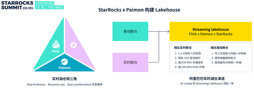 为了打造更开放合作的社区生态,StarRocks还联合生态力量打造了一个知名的“实时湖仓铁三角”,即StarRocks+Flink+Paimon让数据新鲜度、资源消耗和查询性能达到三者兼得。由三者构建的联合共创解决方案,相比普通实时数仓提升了1-5分钟的写入时效性,同时减少90%的存储成本,降低50%的Flink开销。相比离线数仓,写入时效性由小时级别升级到分钟级别,查询时延由分钟级达到秒级,并且还能提供增量更新能力。