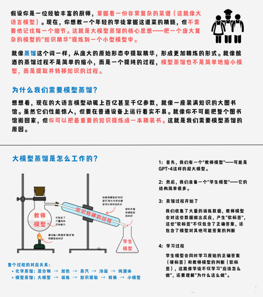 模型蒸馏是DeepSeek的核心技术之一,也是其能够在轻量化模型中保持高性能的关键。简单来说,模型蒸馏的过程就像“老师教学生”:通过将大模型(老师)的知识迁移到小模型(学生)中,让小模型在保持较小规模的同时,具备与大模型相近的能力。