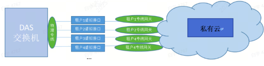 ・通过专线接入的传统IDC或公有云POP点,传统underlay网络和云内overlay网络的vxlan vtep端点起在DAS交换机,专线外underlay到云上overlay 做vxlan封装,云上overlay到专线外underlay 做vxlan解封装;并在物理专线上使用虚拟(逻辑)接口,预留多租户专线网关云外接入云内网络访问能力;