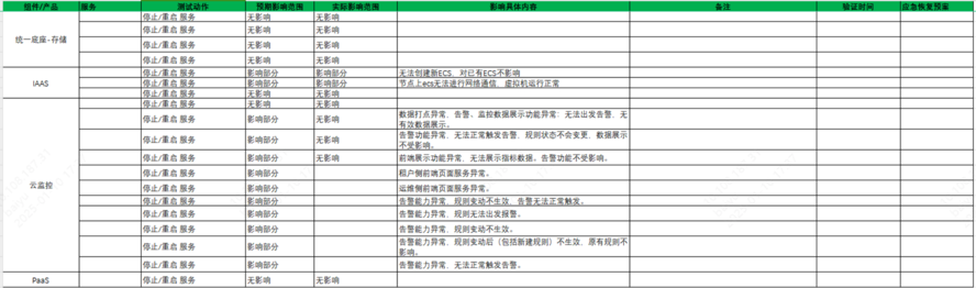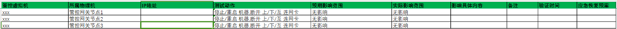 每个测试项分为:测试项目、测试时间、测试动作、功能说明、影响范围、验证结果、优化建议、观测手段、应急预案。