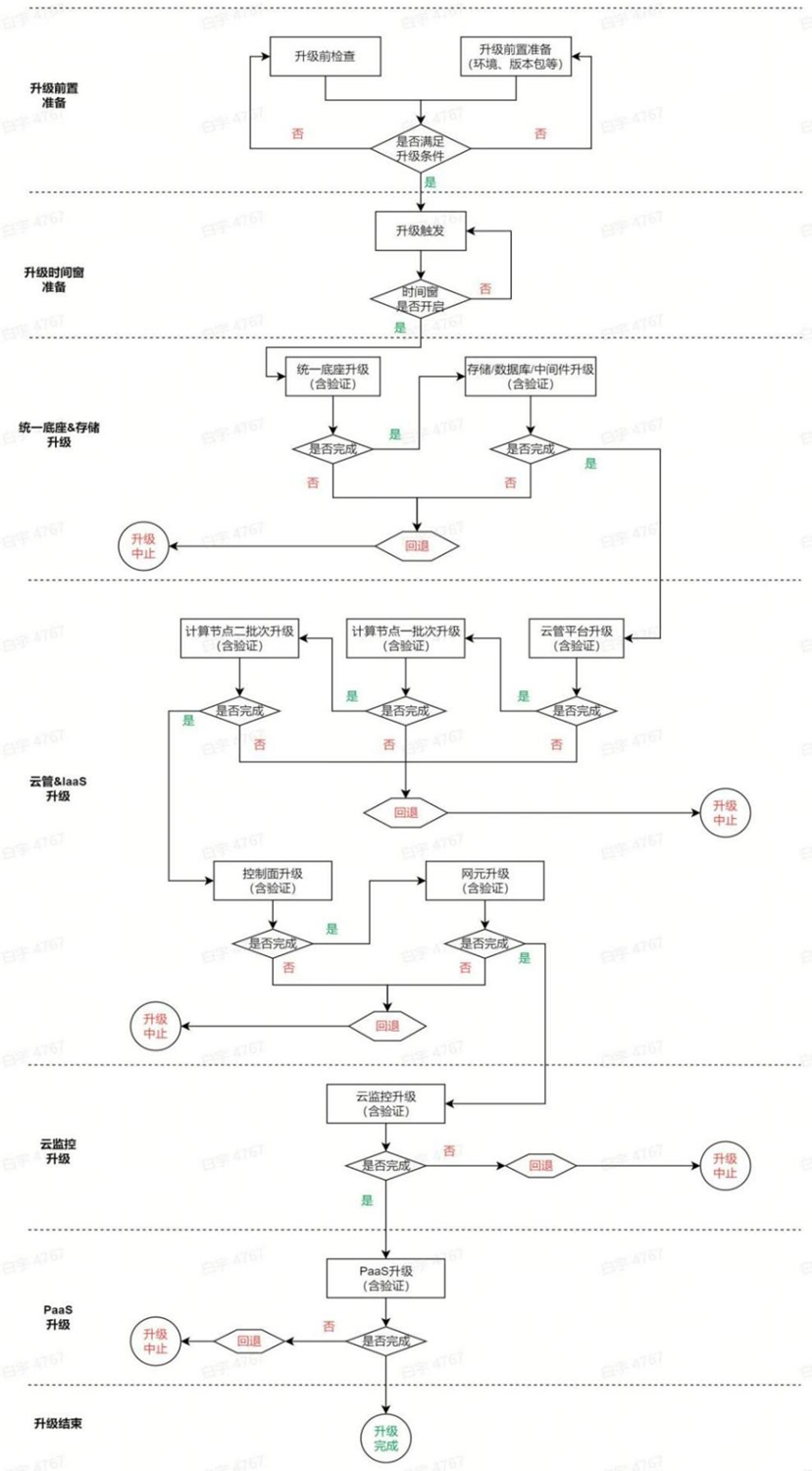由于私有云平台底层厚重(涉及多个管控/网关节点、多个管控面K8S集群)、搭载包括云监控、PaaS集群、数据库/中间件等多种云服务,每次版本升级,前置准备阶段约需要1周时间,实施时间窗口约为1-2周,升级后遗留问题修复约为1-2周,其中每个阶段均需要厂商深度参与,协调后方研发远程及时支撑,避免升级过程中断和升级时间不可控。