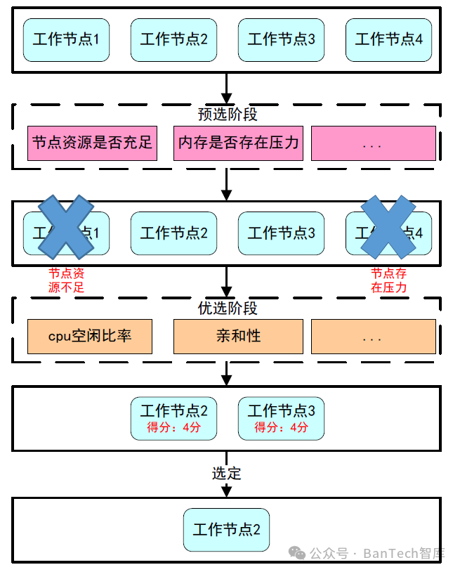 第一步:预选阶段,遍历所有工作节点,筛选出符合要求的候选节点,通过Kubernetes内置的预选策略来进行决策。