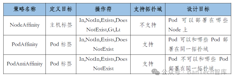 一般情况下,Pod按照集群默认调度流程实现自动部署,但在实际生产中,会有一些特殊的调度需求:比如两个Pod的交互比较频繁,希望这两个Pod调度至同一节点;有时候为了保障高可用,应用的多个副本要求不能调度到同一节点。这种情况下,就涉及到Kubernetes另一个重要概念:亲和性调度,主要分为三类:节点亲和性(NodeAffinity)、Pod亲和性(PodAffinity)和Pod反亲和性(PodAntiAffinity),三种策略的说明见表3。
